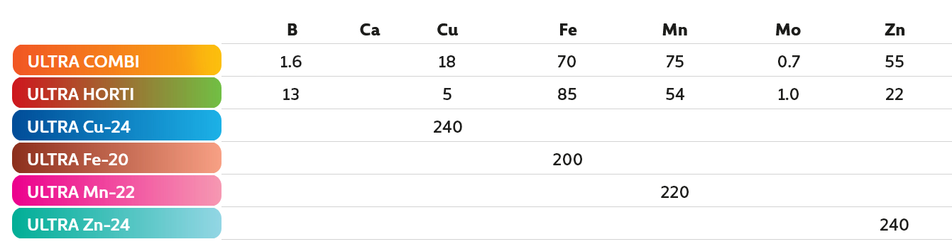 ULTRA Cu-24Fe-20, Mn-22 ve Zn-24 tüm bitki türlerindeki mikro besin eksikliklerini tamamlamayı amaçlayan, ultra-granül formundaki tek bileşenli mikro besin gübreleridir. Belirli besin maddelerinin eksikliklerinin semptomlarını etkili bir şekilde önler ve ortadan kaldırır, uygun bitki büyümesini ve gelişimini sağlar.